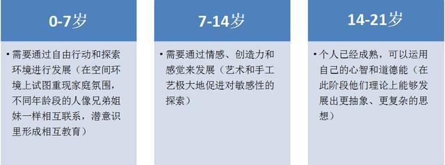 在最初的七年里,孩子非常有必要待在家里,与家人和家庭活动进行直接接触。因此,为这个年龄段孩子提供的教室寻求一种家一般舒适、欢迎、安全、促进的环境。在较大的环境中,为某些活动使用指定的角落是非常常见的。拥有家一般氛围的教室成为了一种对家的隐喻,反之,学校则会代表外部社区。