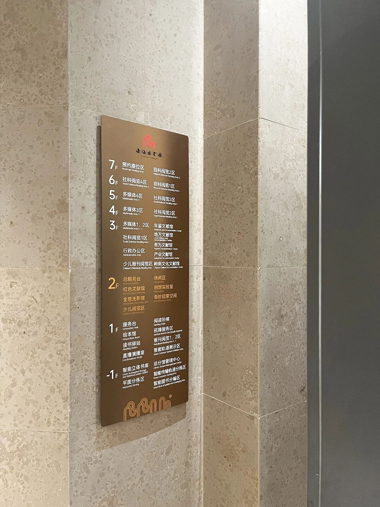 南海图书馆的导视设计,是一场建筑美学与导视功能的双向奔赴。我们没有刻意张扬设计痕迹,而是以克制的设计手法,让导视系统扎根于建筑理念之中,融合品牌VI的核心特质,凭借喷砂玫瑰金哑光不锈钢与亚克力烤漆立体字的质感碰撞,既满足了现代图书馆的功能需求,又延续了建筑的简约大气与人文温度,让每一次指引,都成为一场与建筑美学、人文书香的温柔相遇。